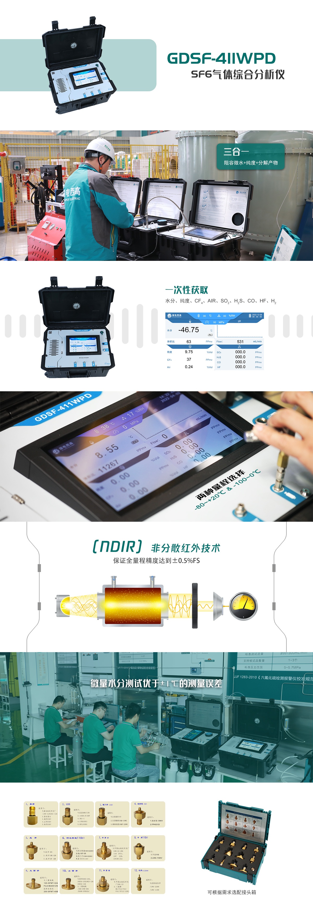 GDSF-411WPD帶泵回 SF6氣體綜合分析儀全部采用了國外最優(yōu)秀的傳感器;濕度采用穩(wěn)定并且可靠的芬蘭維薩拉、純度采用德國Smart-GAS NDIR原理傳感器,分解物測試采用瑞士曼巴波傳感器。彩色液晶顯示,實時顯示各種參數(shù),內置充電電池,交直流兩用。