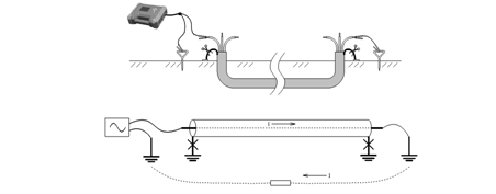 電流自發(fā)射機流經芯線,在電纜對端進入大地,流回近端返回發(fā)射機。這種接法在地面探測時接收機可以感應到很強的信號國電西高信號特性比較明確,可以充分利用儀器的防誤跟蹤功能;信號在絕緣良好的芯線上流過,不會流到鄰近管線上,尤其不會流到交叉的金屬管道上,最適于在復雜環(huán)境下進行路徑查找。另外由于電纜接地,流經電纜的信號電壓很低,不容易對鄰線產生電容耦合,減少干擾。