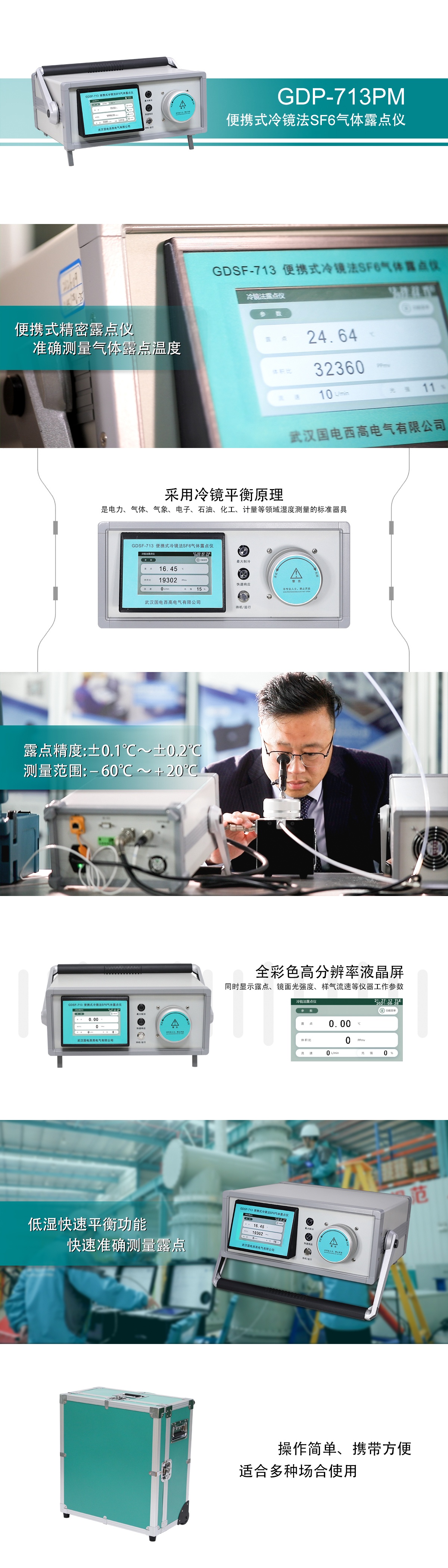 GDP-713PM 便攜式冷鏡法SF6氣體露點儀是用高新技術制造的便攜式精密露點儀,它可準確測量氣體的露點溫度。高品質的露點傳感器與智能化電子控制技術的完美結合,使其成功應用于各種環境條件下露點的準確測量。
