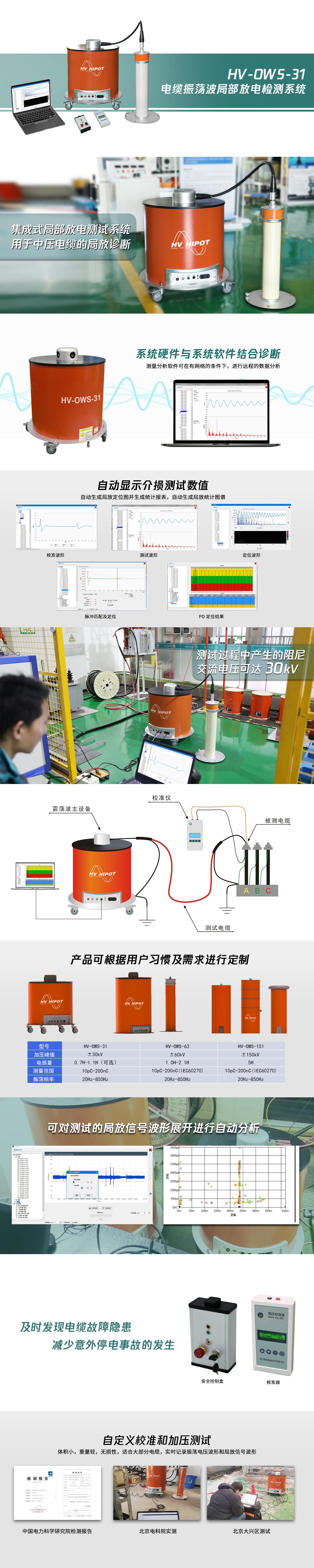 HV-OWS-31系列是集成式局部放電測試系統,主要用于中壓電纜的局放診斷。系統測試頻率為20HZ到幾百HZ阻尼交流電壓,系統在測試過程中產生的阻尼交流電壓可達30kV,并結合先進的系統硬件與系統軟件進行診斷。