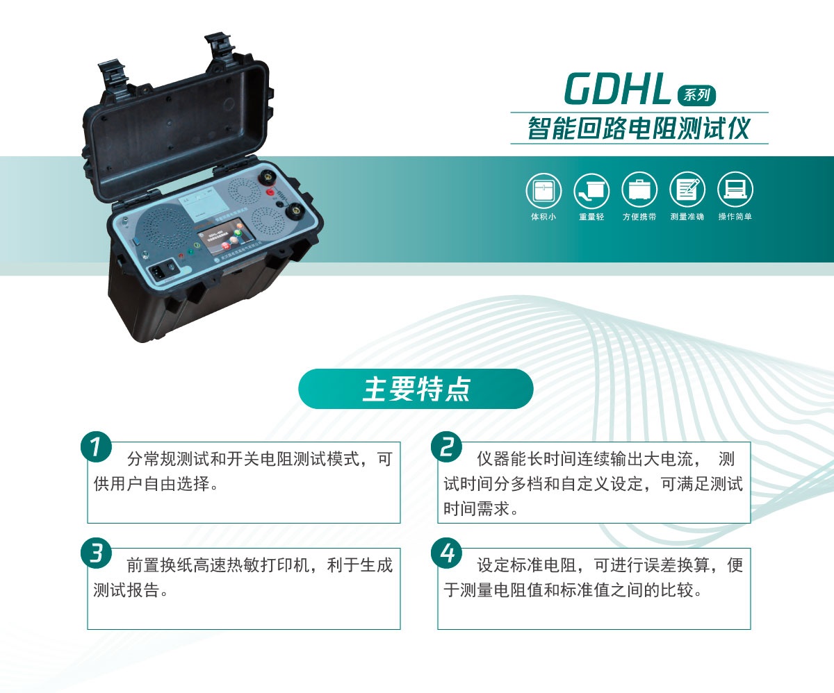 GDHL系列智能回路電阻測試儀采用先進的大功率開關電源技術和先進的電子線路精制而成。是高壓、中壓以及低壓斷路器、開關回路電阻、大電流匯流排(如銅排、鋁排等)連接點電阻、套管連接處的接點電阻、電纜連接點電阻以及焊接點處電阻等的專用測試儀器。電阻值的測量電流采用國家標準GB736所推薦的不小于100A電流。本儀器具有體積小、重量輕、抗干擾能力強、精度高、操作方便、保護功能完善等特點。