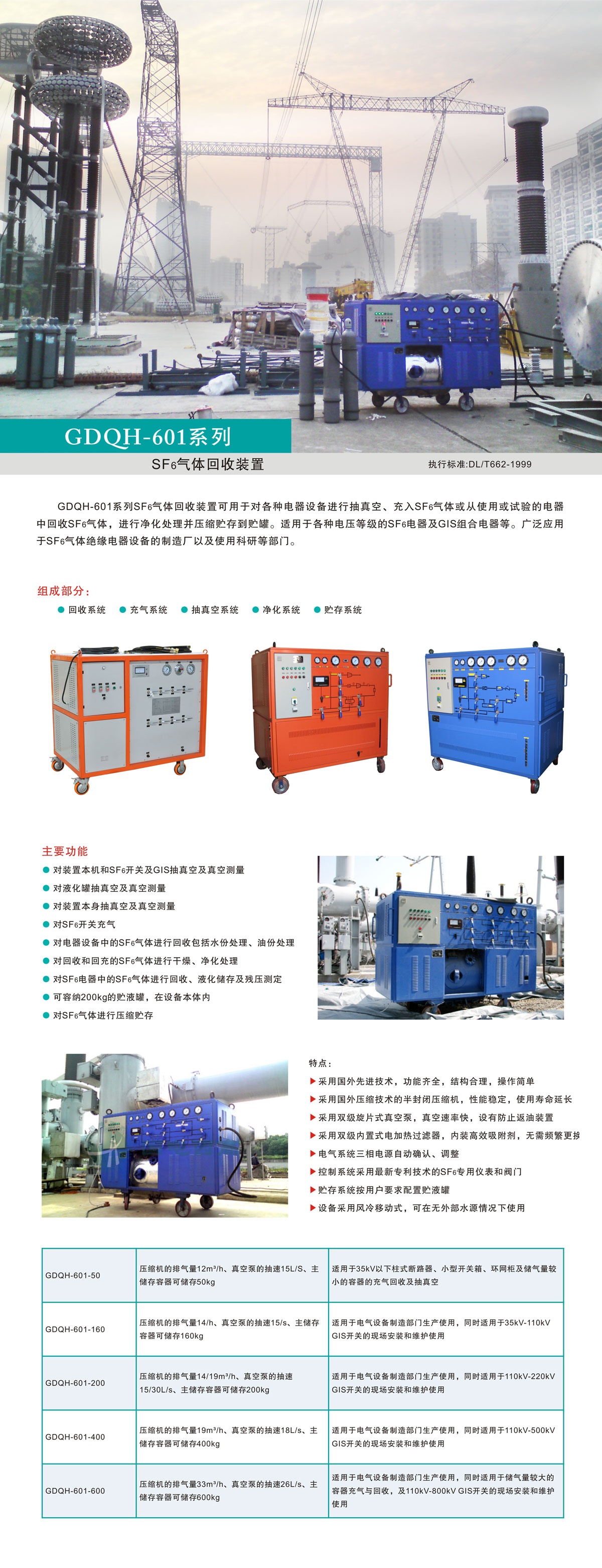 · 對電器設備中的SF6氣體進行回收包括水份處理、油份處理;