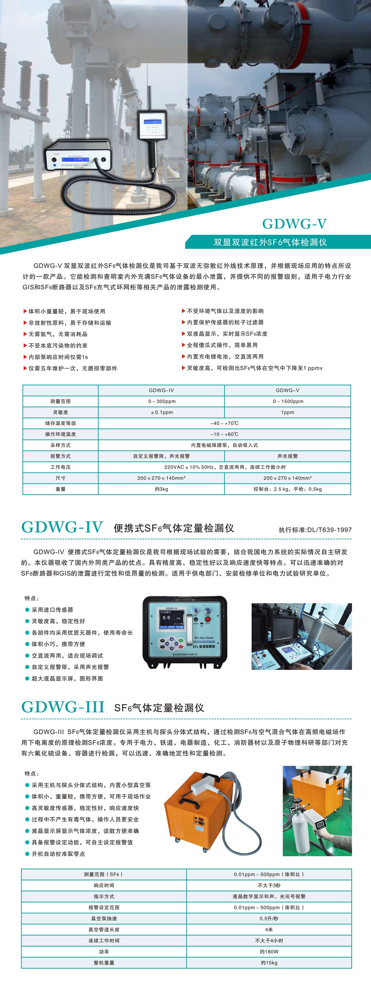GDWG-V 雙顯雙波紅外SF6氣體檢漏儀是我司基于雙波無彌散紅外線技術原理,并根據現場應用的特點所設計的一款產品。它能檢測和查明室內外充滿SF6氣體設備的最小泄露,并提供不同的報警級別,適用于電力行業GIS和SF6斷路器以及SF6充氣式環網柜等相關產品的泄露檢測使用。