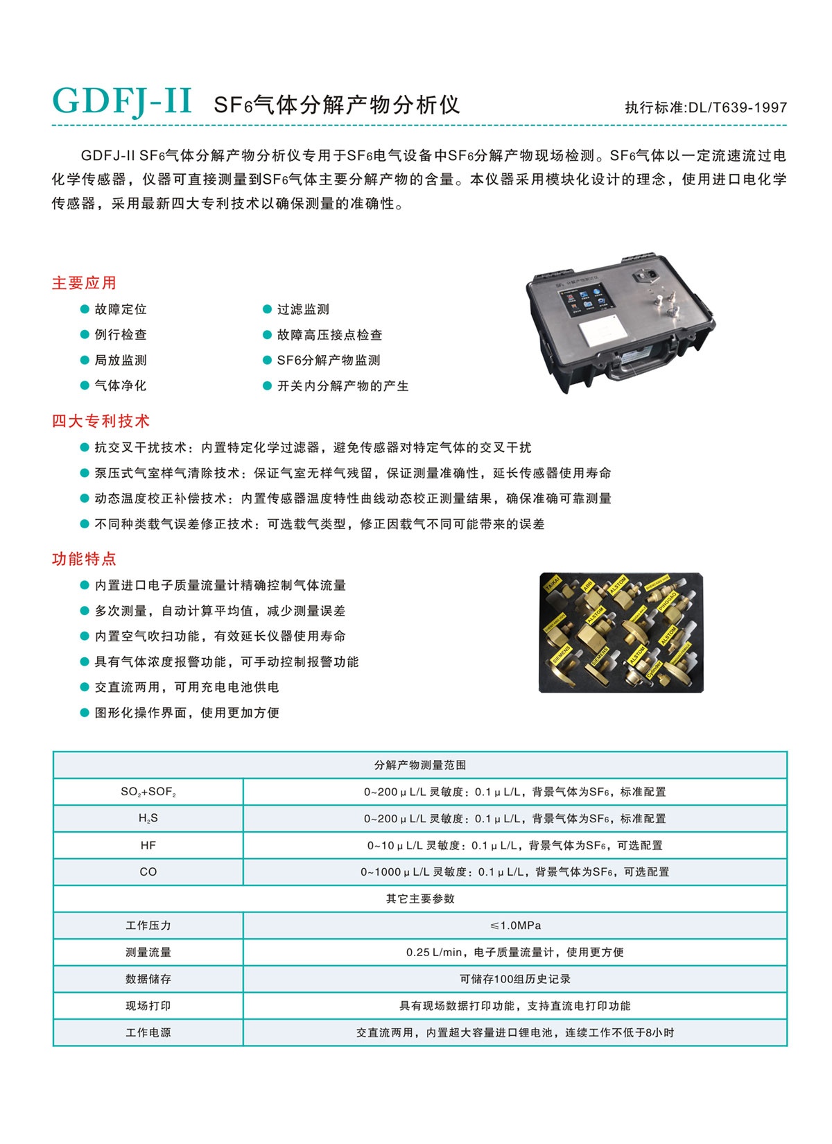 GDFJ-II SF6氣體分解產物分析儀專用于SF6電氣設備中SF6分解產物現場檢測。SF6氣體以一定流速流過電化學傳感器,儀器可直接測量到SF6氣體主要分解產物的含量。本儀器采用模塊化設計的理念,使用進口電化學傳感器,采用最新四大專利技術以確保測量的準確性。