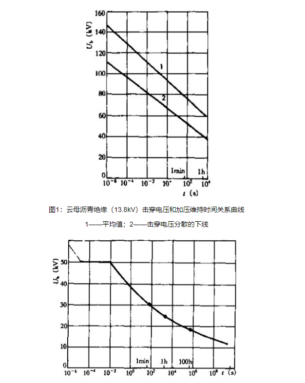 對于云母瀝青絕緣(13.8kV),維持1min的擊穿電壓為75kV,維持1h的擊穿電壓為60kV。