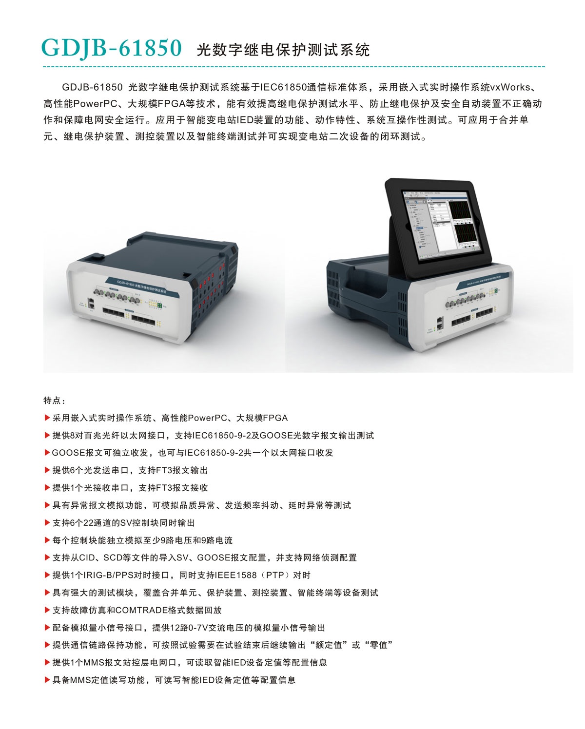 GDJB-61850 光數字繼電保護測試系統基于IEC61850通信標準體系,采用嵌入式實時操作系統vxWorks、高性能PowerPC、大規模FPGA等技術,能有效提高繼電保護測試水平、防止繼電保護及安全自動裝置不正確動作和保障電網安全運行。應用于智能變電站IED裝置的功能、動作特性、系統互操作性測試??蓱糜诤喜卧?、繼電保護裝置、測控裝置以及智能終端測試并可實現變電站二次設備的閉環測試。