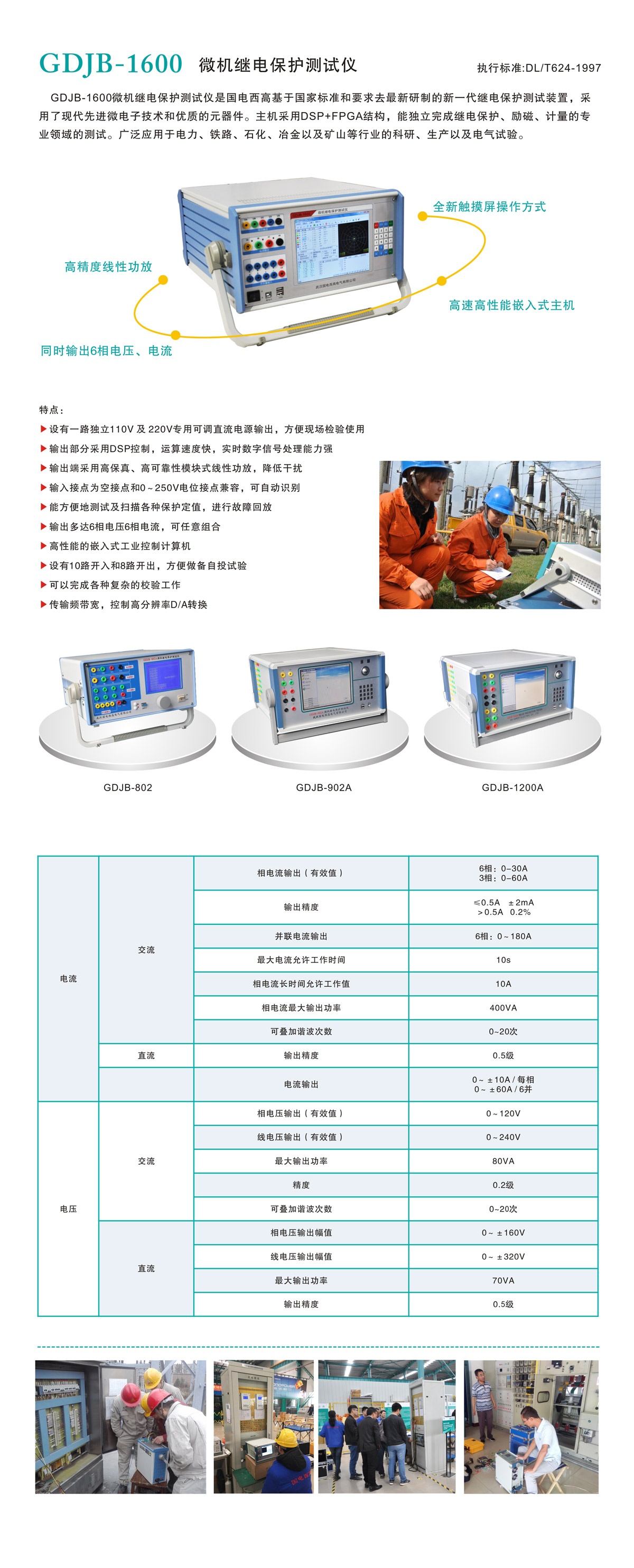 GDJB -1600多功能微機(jī)繼電保護(hù)測(cè)試系統(tǒng)是國電西高公司參照中華人民共和國電力行業(yè)標(biāo)準(zhǔn)《DL/T624-1997 繼電保護(hù)微機(jī)型試驗(yàn)裝置技術(shù)條件》,在廣泛聽取用戶意見和GDJB-1200的基礎(chǔ)上,認(rèn)真總結(jié)多年積累的產(chǎn)品開發(fā)和生產(chǎn)經(jīng)驗(yàn),采用目前最新的電子技術(shù)研制的新一代微機(jī)繼電保護(hù)測(cè)試裝置,可以獨(dú)立完成繼電保護(hù)、勵(lì)磁、 計(jì)量等專業(yè)領(lǐng)域內(nèi)的裝置和元器件測(cè)試調(diào)試,微機(jī)繼電保護(hù)測(cè)試儀廣泛適用于電力、鐵路、石化、 冶金和礦山等行業(yè)的科研、生產(chǎn)和電氣試驗(yàn)現(xiàn)場(chǎng)。