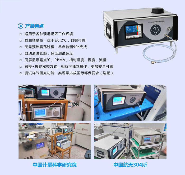 其中,GDP-8000CM型便攜式冷鏡法SF6氣體露點儀通過國家一級計量院“中國計量科學研究院”“中國航空304所”檢測,精度優于±0.2℃。