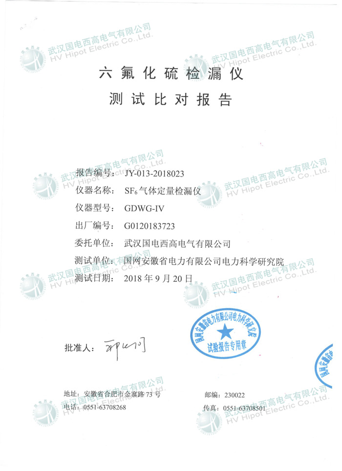 GDWG-IV型SF6氣體定量檢漏儀,則是通過了安徽省電力科學研究院(國家電網SF6氣體實驗室)氣體濃度檢測。相比較國內其他廠家,我公司產品有著檢測速度快,檢測數據穩定,準確的優點。得到了安徽院專家的認可。
