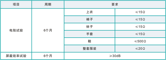 其次,需要對屏蔽服的安全性能進行測量,保證有效阻斷電流,確保試驗人員安全。依據國家規定,需每半年對屏蔽服進行電阻試驗及屏蔽服效率試驗。具體要求如下表: